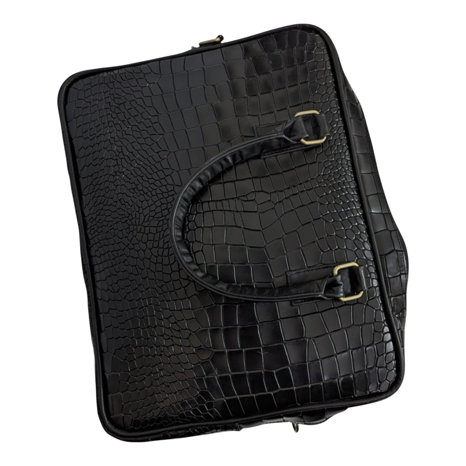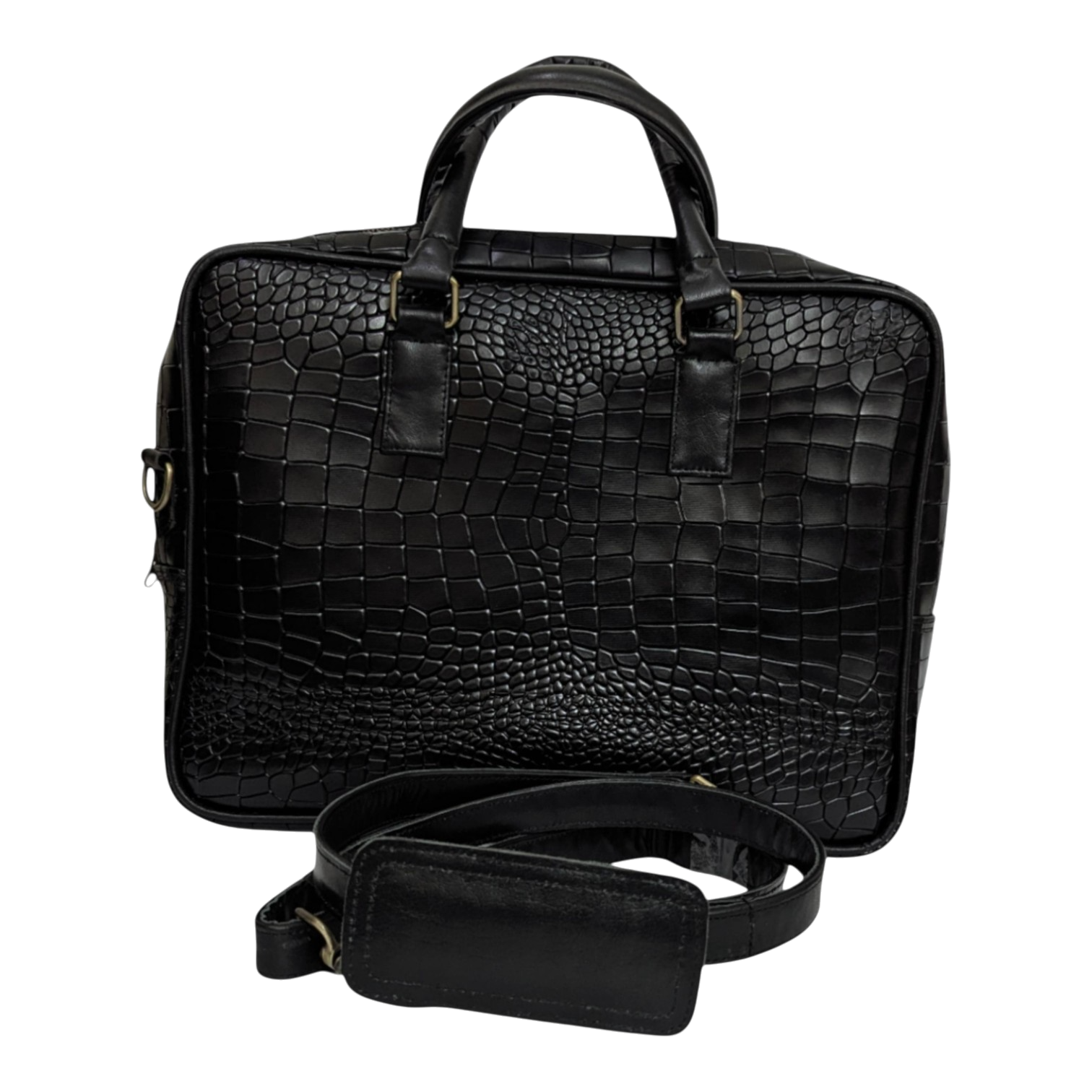 Elevate your professional ensemble with this premium black work bag. Made from high-quality cowhide leather with a distinctive crocodile-embossed texture, it offers a luxurious feel and durable construction suitable for any gender. This bag is perfectly sized for laptops and important documents, keeping them secure with a robust top zipper. Its sleek design with sturdy top handles ensures you look polished and prepared. Approx. Measurements: 15" L x 3" W x 11.25" H Color: Black Material: Cowhide Leather (Crocodile Embossed) Closure: Zipper Like new, a must-have for the discerning professional!