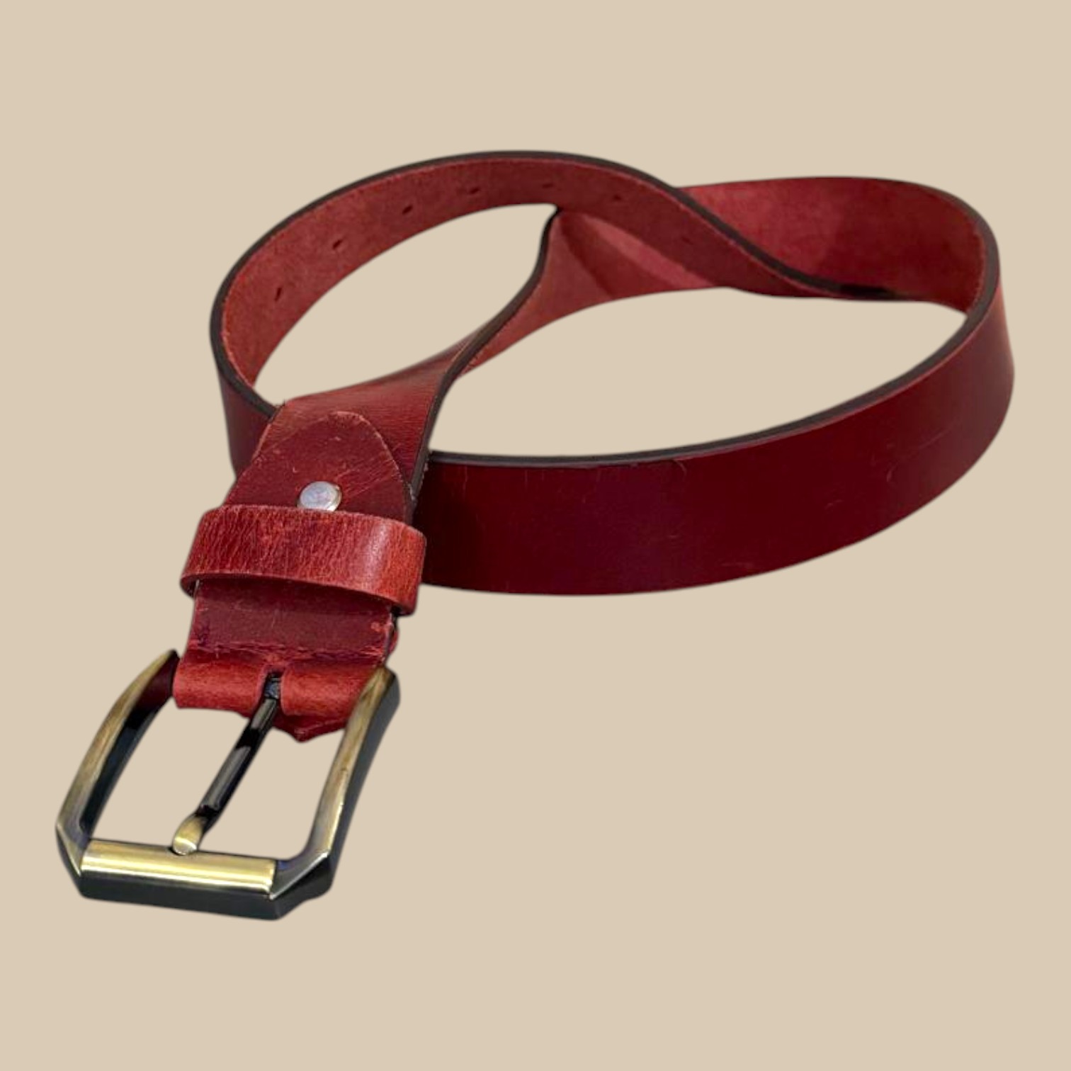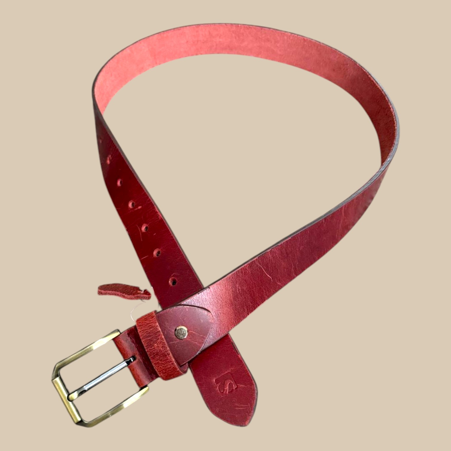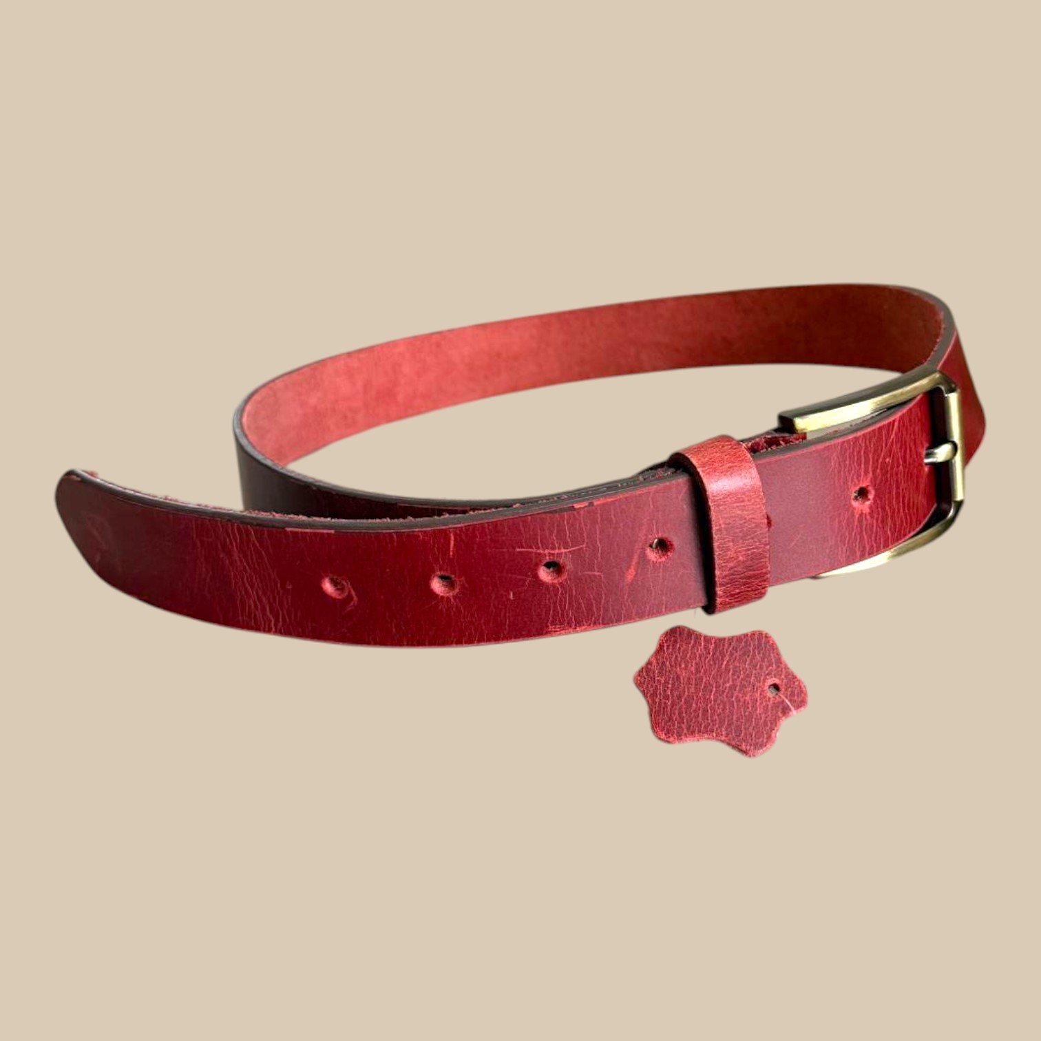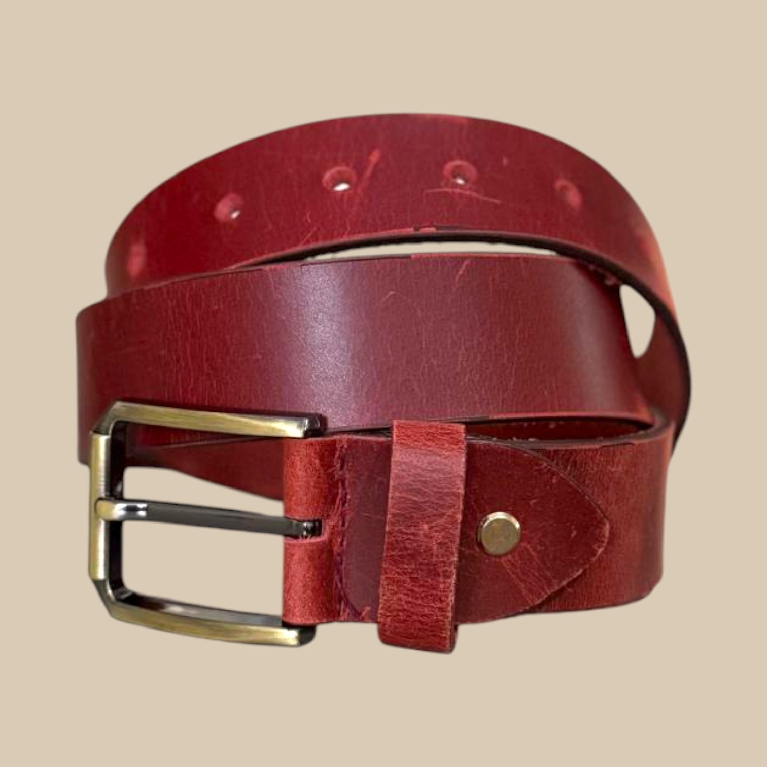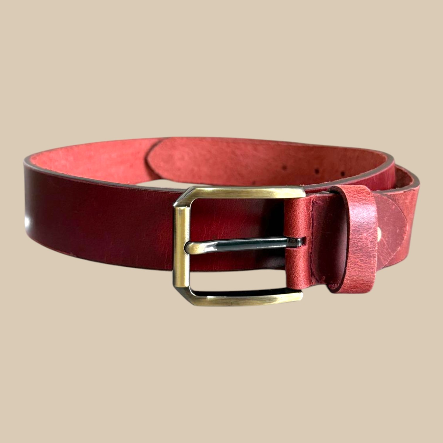 The Men’s Red Leather Belt with Brass Buckle is made for men who value quality and craftsmanship. Each belt is cut from full-grain cowhide leather, giving it a firm yet flexible feel that gets even better with age. The rich red tone has a natural depth that pairs well with denim, chinos, and casual trousers, offering a standout accent to any outfit.