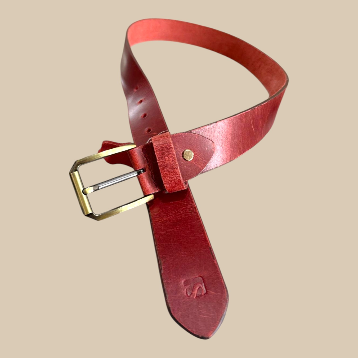 The antique brass buckle adds a classic touch. Its warm golden-brown finish complements the deep leather tone while offering real strength and durability. The buckle is designed to resist tarnish, keeping its natural shine over time. Together, the leather and brass create a combination that feels both bold and timeless.
