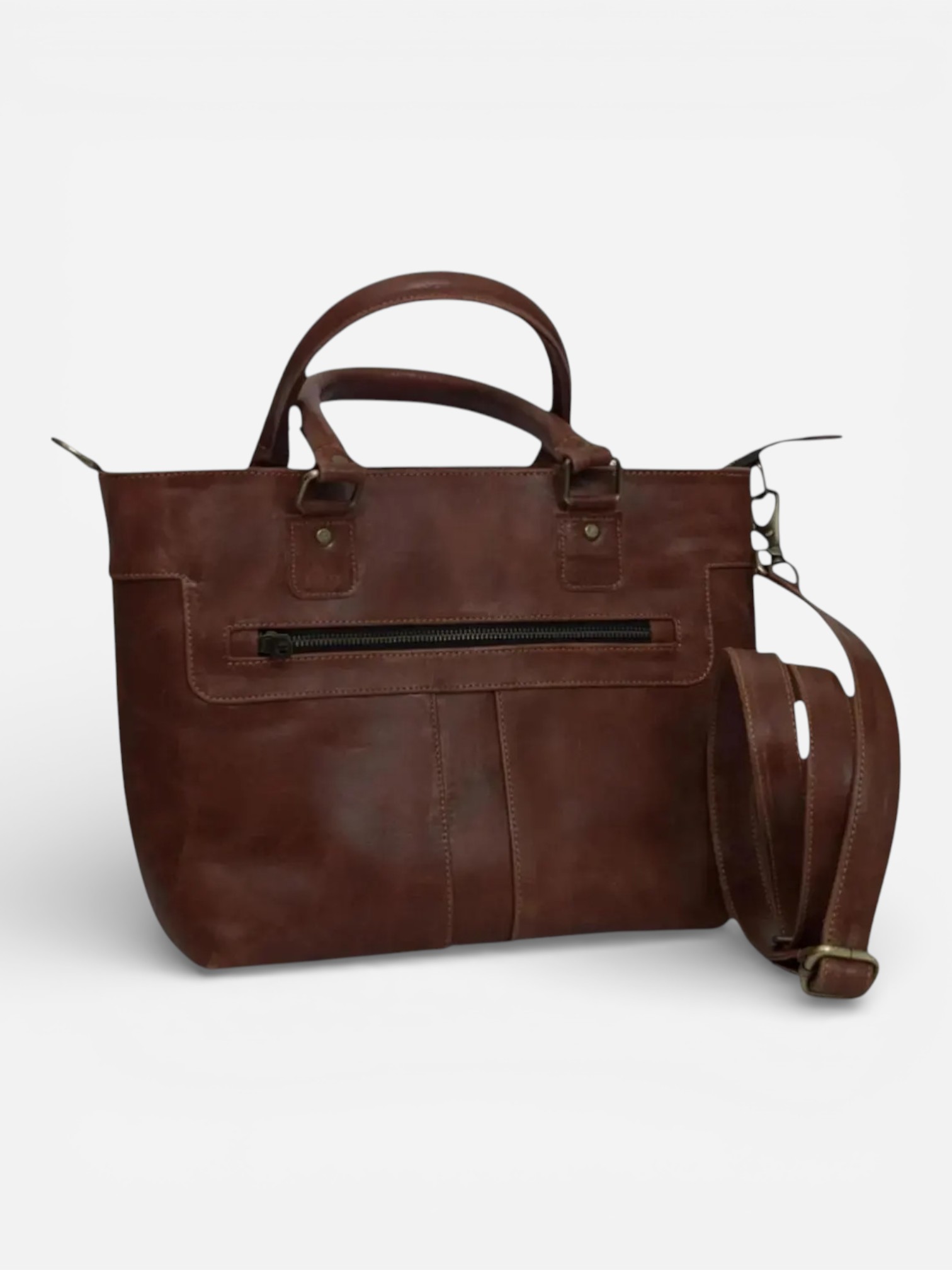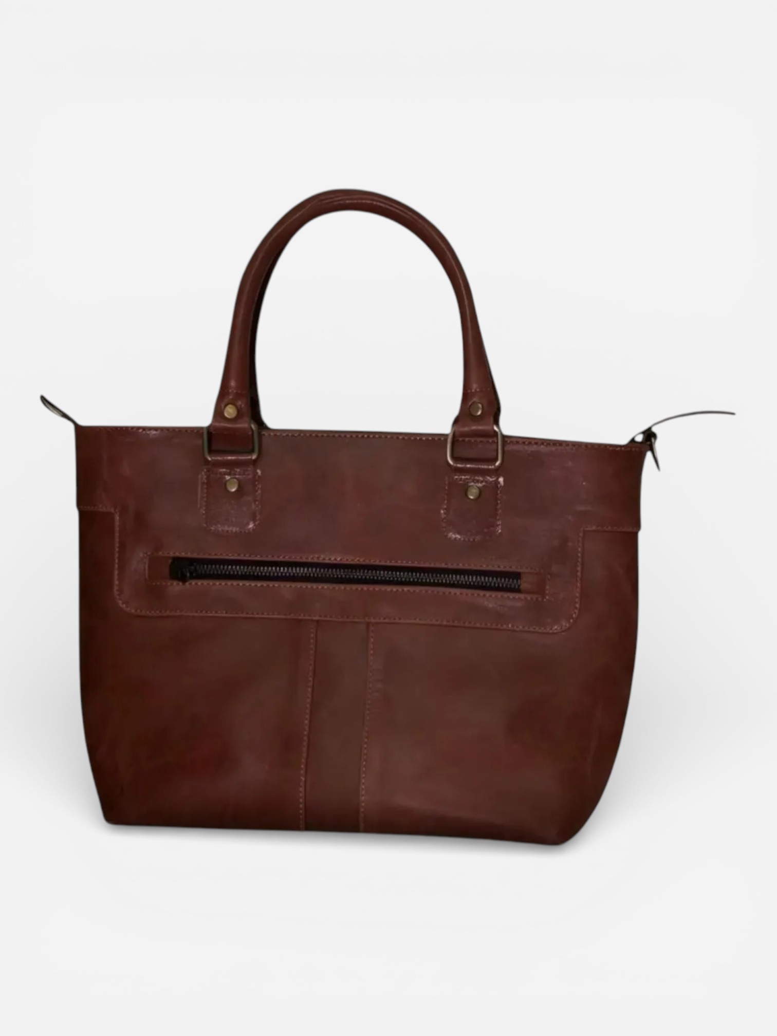 This brown leather tote bag is made from soft, genuine cowhide leather and built for everyday use. It has a roomy interior, comfortable handles, and a warm brown color that goes with anything. Simple, practical, and made to last. Features Made from 100% genuine leather with a smooth, soft finish Spacious interior for daily items and work essentials Top handles are designed for a comfortable hold D-rings included for attaching a shoulder strap Secure zip closure to keep belongings safe Reinforced base with strong stitching Light in weight yet sturdy for everyday use Fits a tablet, notebook, or small laptop Warm brown color that complements all styles Designed for daily wear, travel, or work