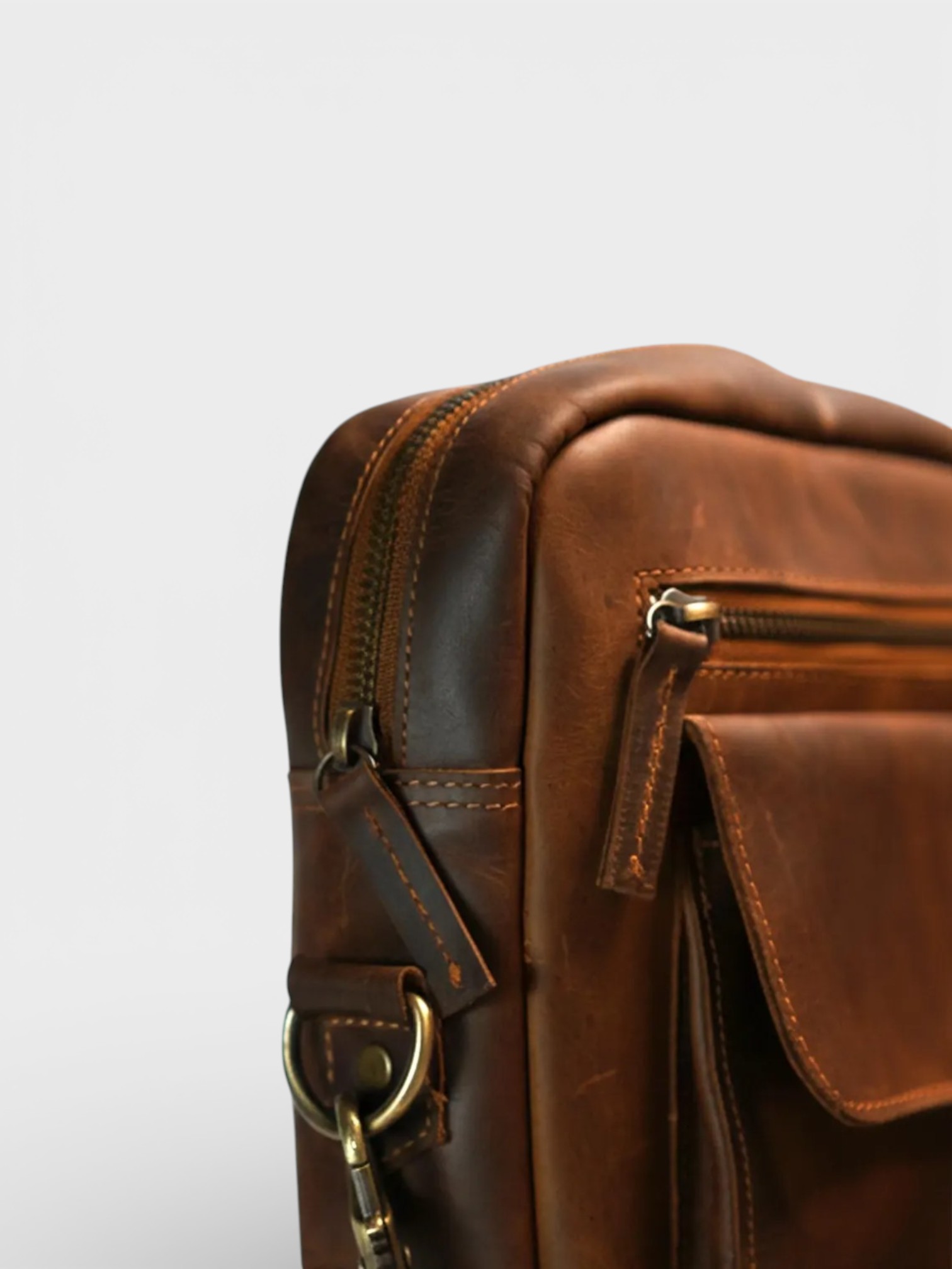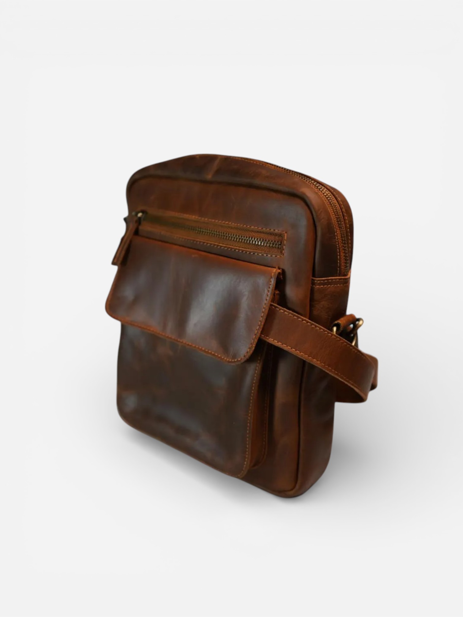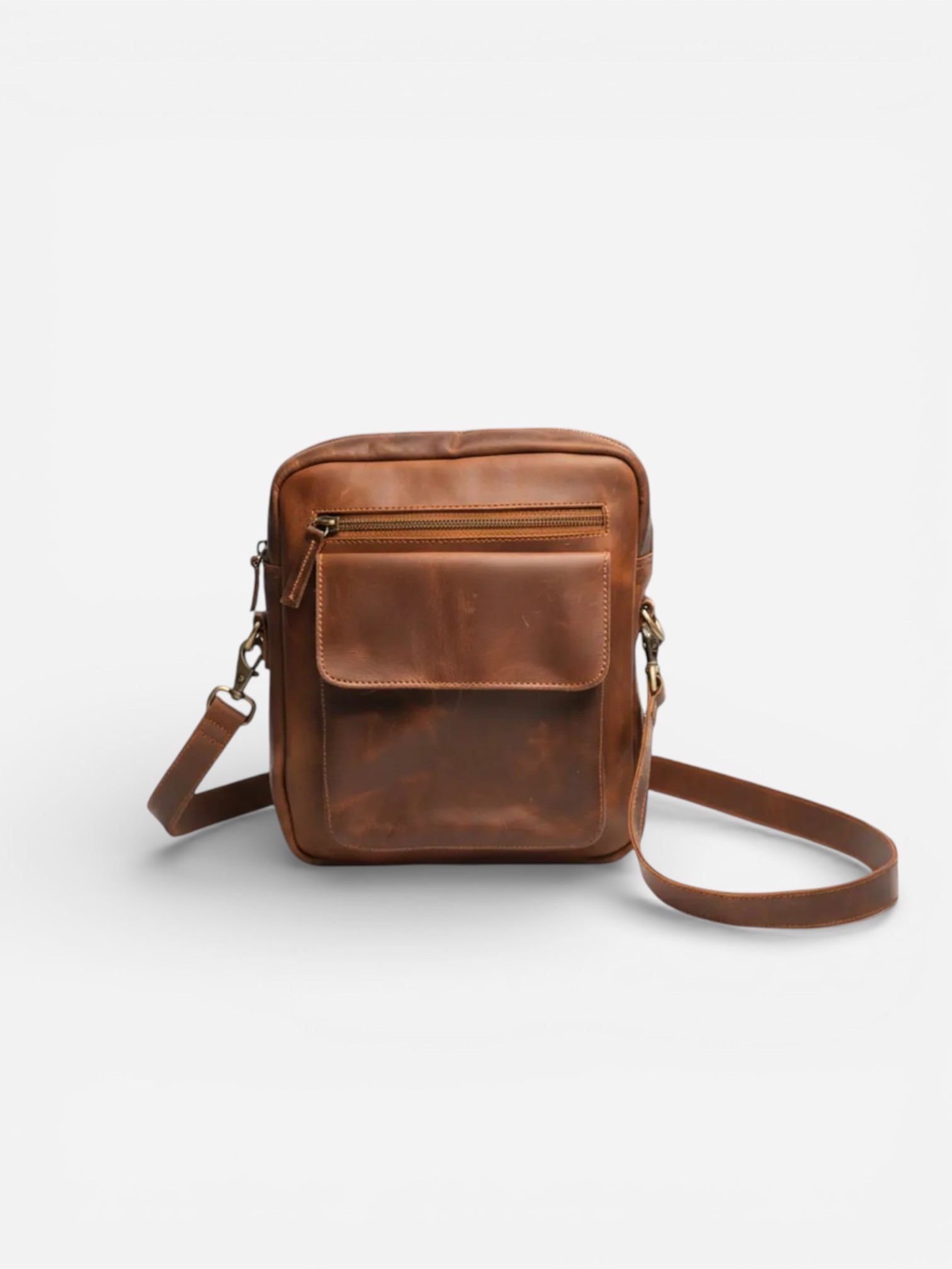 Embrace vintage style with this compact leather messenger bag. Made from genuine cowhide, its multiple pockets and rugged design are perfect for organizing your daily essentials. Product Features Distressed Cowhide Leather: Crafted from 100% genuine cowhide with a beautiful, rugged texture that gets better with age. Compact & Functional Design: A sleek, rectangular shape with multiple zippered and flap pockets for easy organization. Adjustable Crossbody Strap: Features a long, adjustable strap with a comfortable shoulder pad for carrying across the body or over the shoulder. Secure Storage: Equipped with high-quality zippers and a front flap-over pocket to keep your essentials safe. Vintage Brass Hardware: Features classic brass-colored hardware that complements the bag’s rustic, timeless appeal.