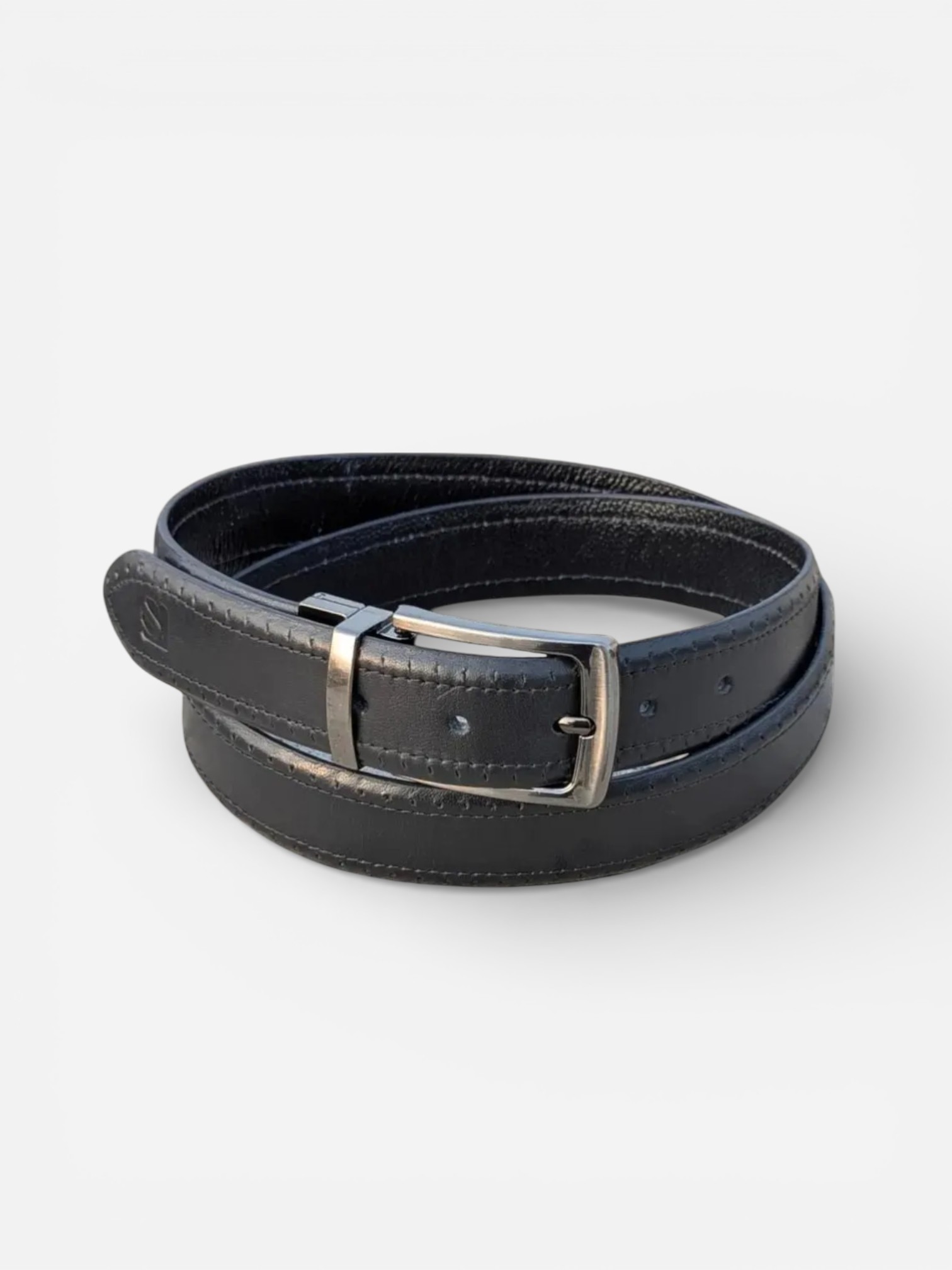 A single belt that works twice as hard. This reversible black leather belt gives you two timeless looks in one, smooth on one side, textured on the other. Handcrafted from genuine cowhide leather with a sleek silver buckle, it’s built for comfort, flexibility, and everyday style. Features Made from 100% genuine cowhide leather for long-lasting durability Fully reversible design, two styles in one Smooth and textured sides for formal or casual outfits Sleek silver buckle with easy swivel mechanism 1.4-inch width fits most pant loops perfectly Adjustable for a comfortable, custom fit Subtle dotted stitching adds a refined finish Designed for both business and weekend wear