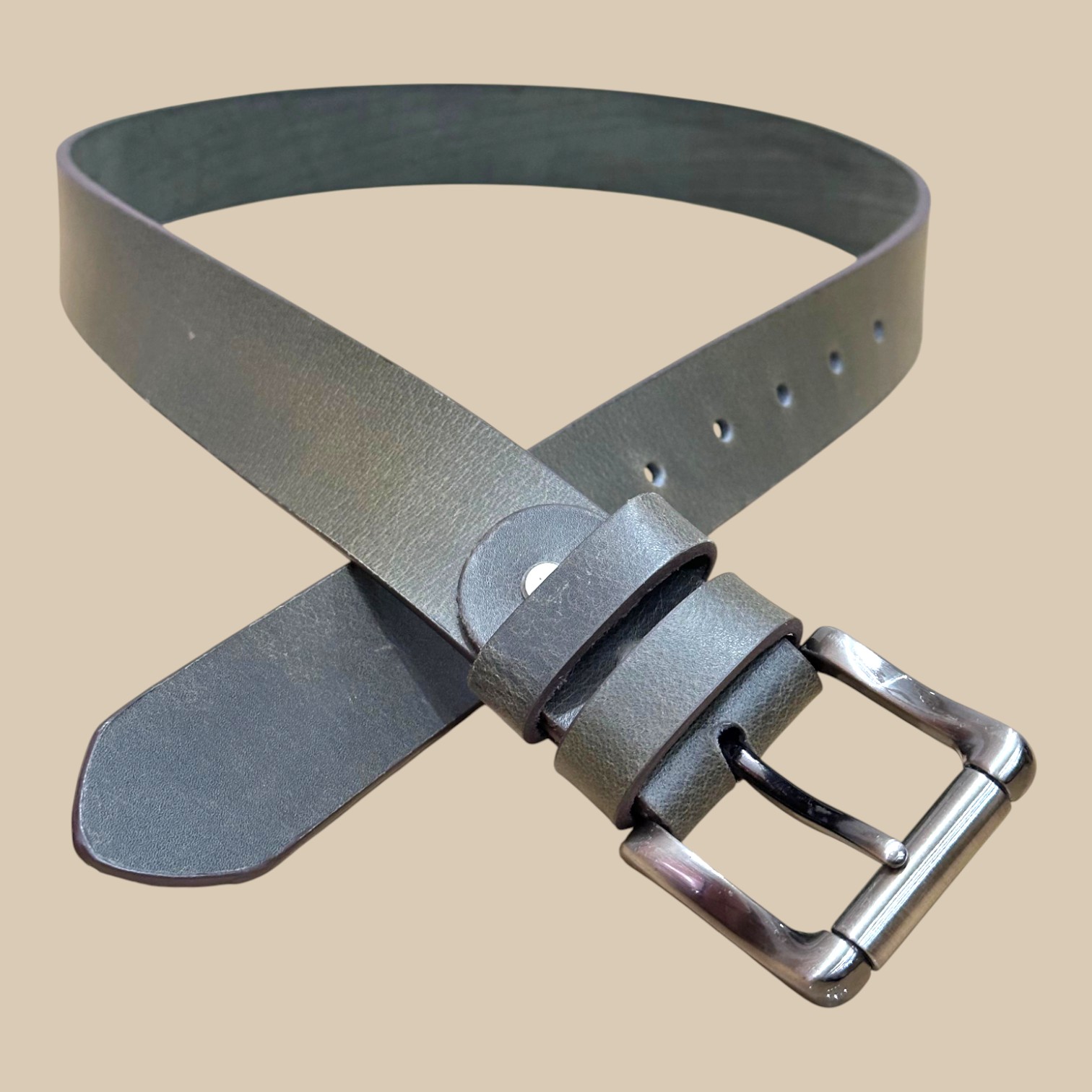 Embrace a bold look with this rugged Olive Green Leather Belt. Featuring a wide leather strap and a substantial, polished steel buckle, this belt is built for durability and noticeable style. The rich, muted olive color and full-grain leather construction ensure it will be a long-lasting, heavy-duty accessory that elevates your favorite denim and casual trousers.