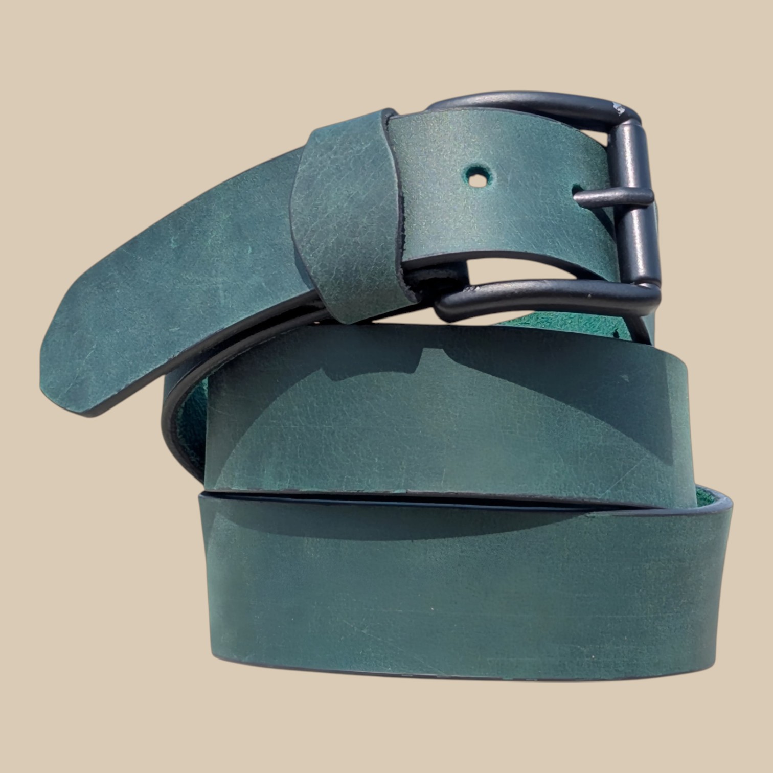 A bold twist on a classic. This rustic green cowhide leather belt with a dark gunmetal buckle is strong, stylish, and ready for both jeans and dress trousers.