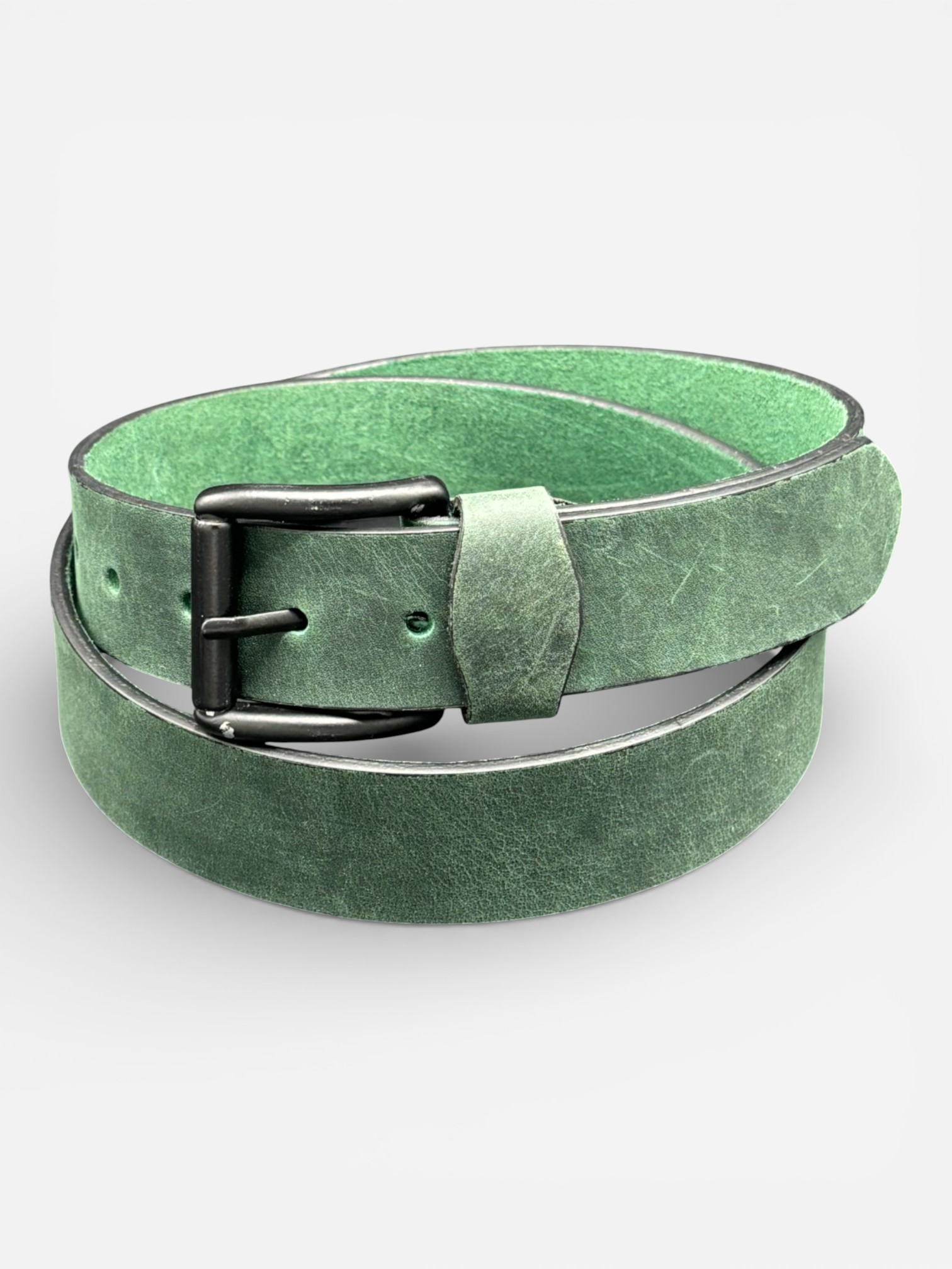 A bold twist on a classic. This rustic green cowhide leather belt with a dark gunmetal buckle is strong, stylish, and ready for both jeans and dress trousers. Features Genuine cowhide leather Rustic green finish Dark gunmetal-tone buckle Durable everyday design Works with casual and formal outfits
