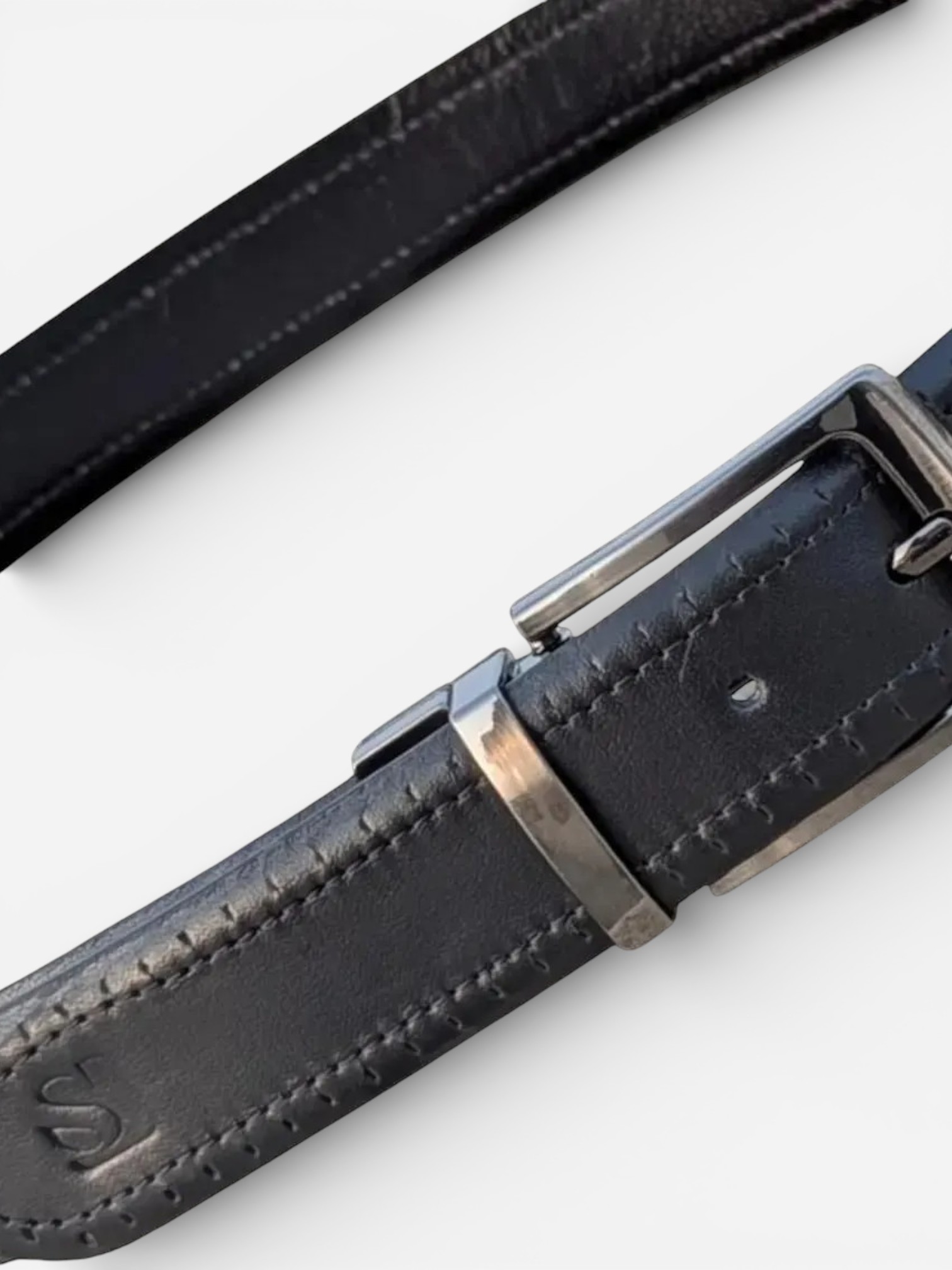A single belt that works twice as hard. This reversible black leather belt gives you two timeless looks in one, smooth on one side, textured on the other. Handcrafted from genuine cowhide leather with a sleek silver buckle, it’s built for comfort, flexibility, and everyday style. Features Made from 100% genuine cowhide leather for long-lasting durability Fully reversible design, two styles in one Smooth and textured sides for formal or casual outfits Sleek silver buckle with easy swivel mechanism 1.4-inch width fits most pant loops perfectly Adjustable for a comfortable, custom fit Subtle dotted stitching adds a refined finish Designed for both business and weekend wear