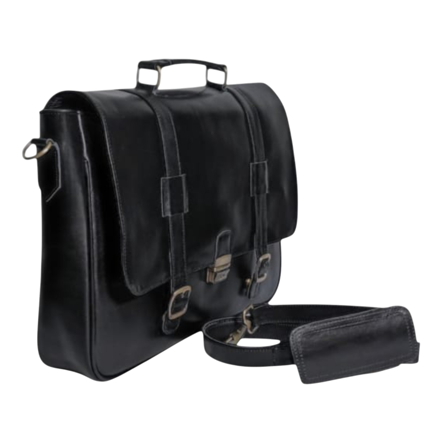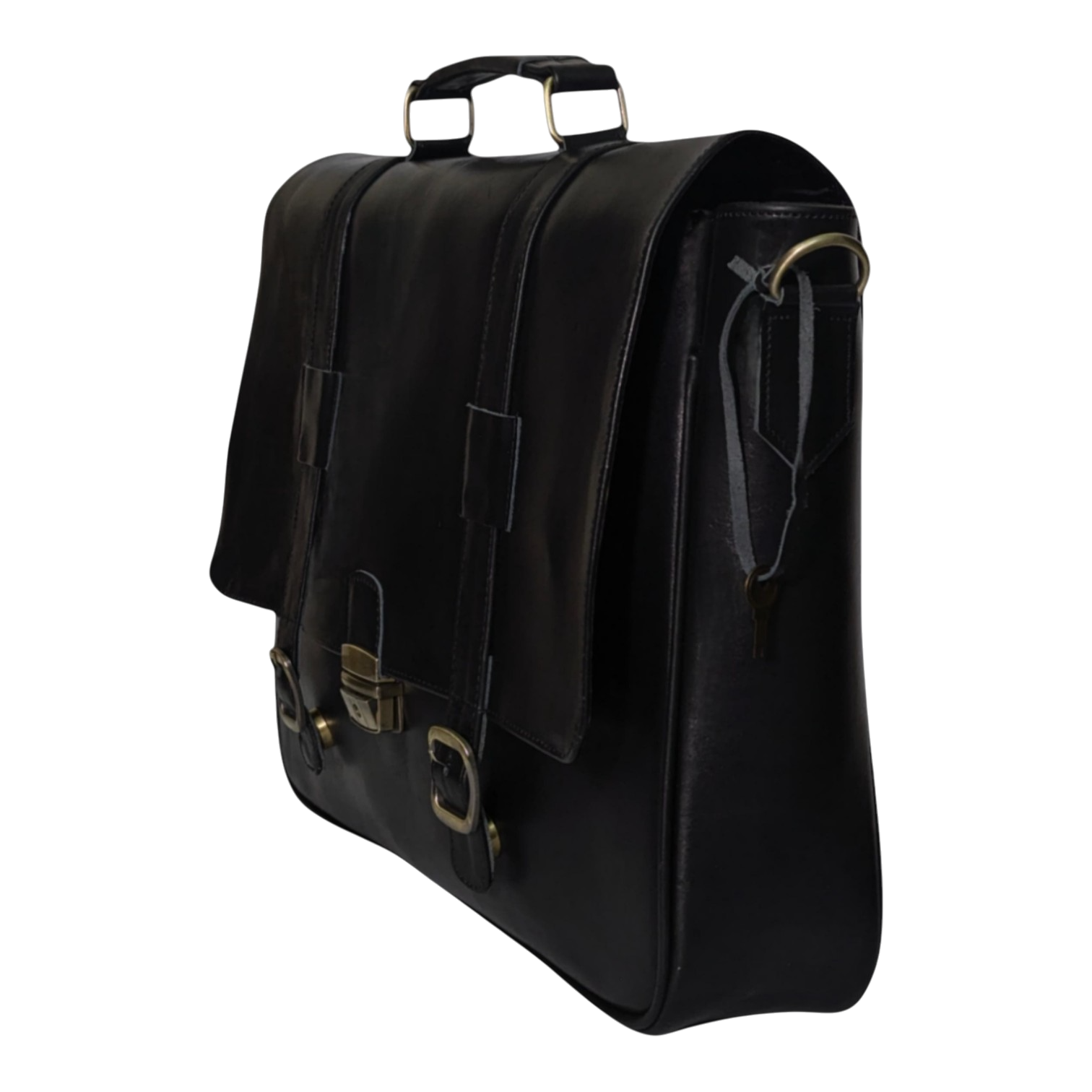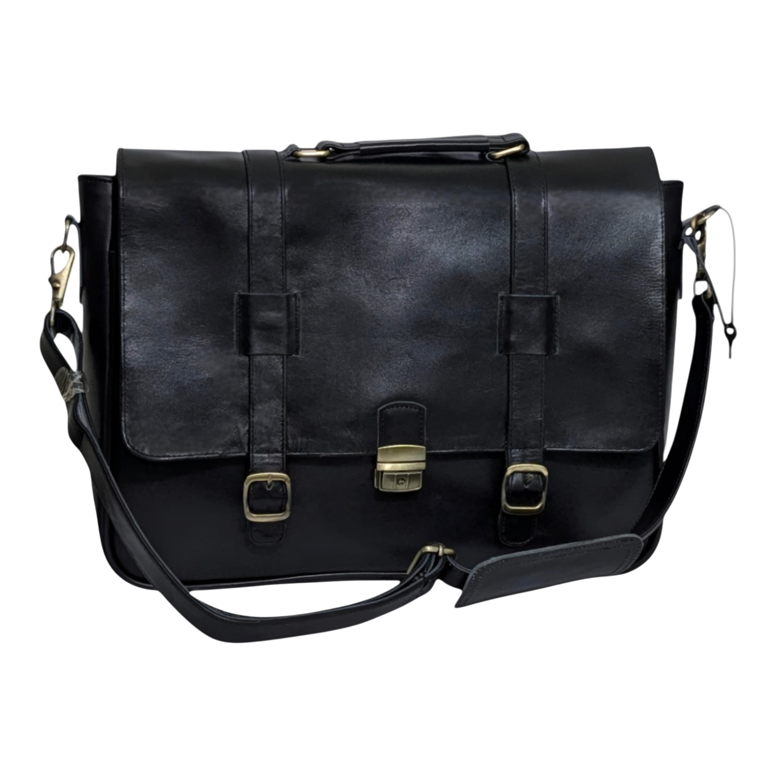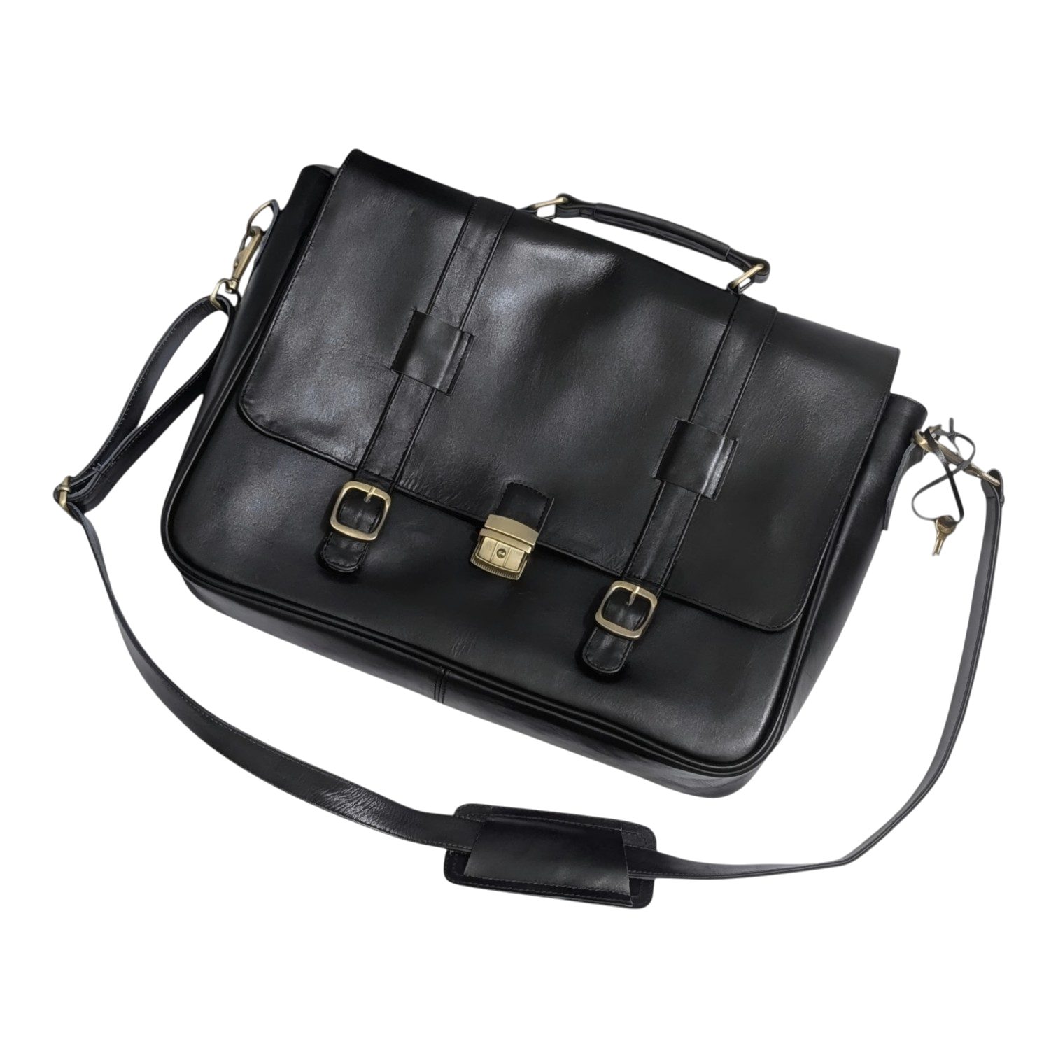 Make a statement with this timeless black leather laptop bag, crafted from premium, smooth genuine cowhide. Its classic briefcase/messenger style features a sophisticated front flap with decorative buckles and a central metallic clasp. Perfect for professionals, students, or anyone needing to carry their tech and documents in style. It offers a comfortable top handle and a detachable, adjustable shoulder strap for versatile carrying. Color: Black Material: Genuine Cowhide Leather (Smooth Finish) Dimensions: Approximately 12.5 inches (L) x 3.25 inches (W/D) x 12.0 inches (H) Style: Laptop Bag / Briefcase / Messenger Bag