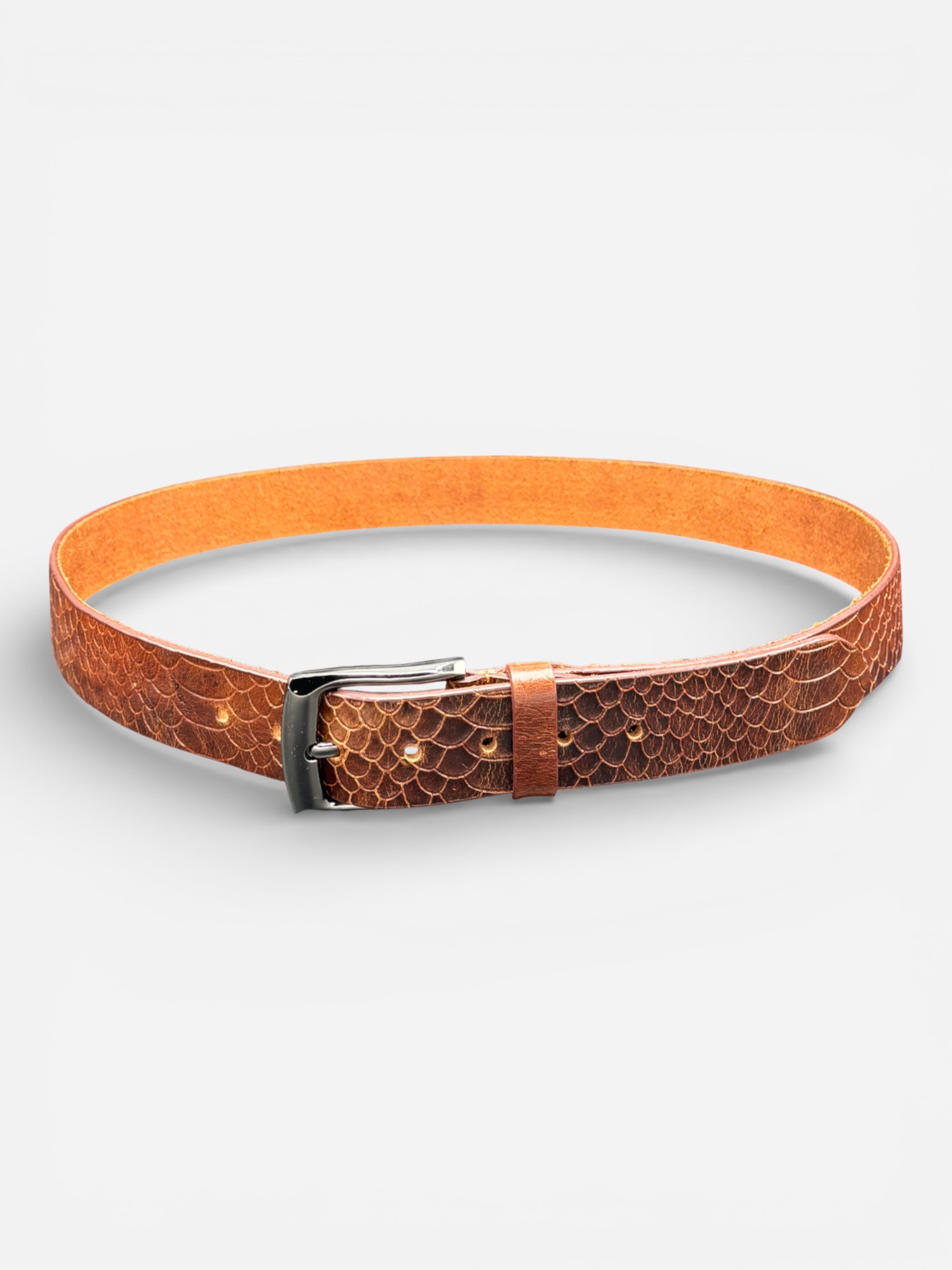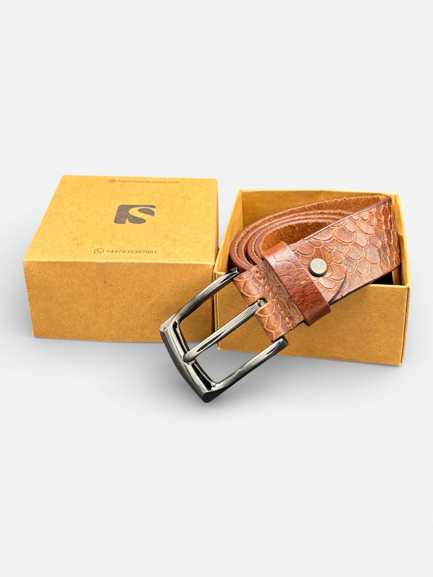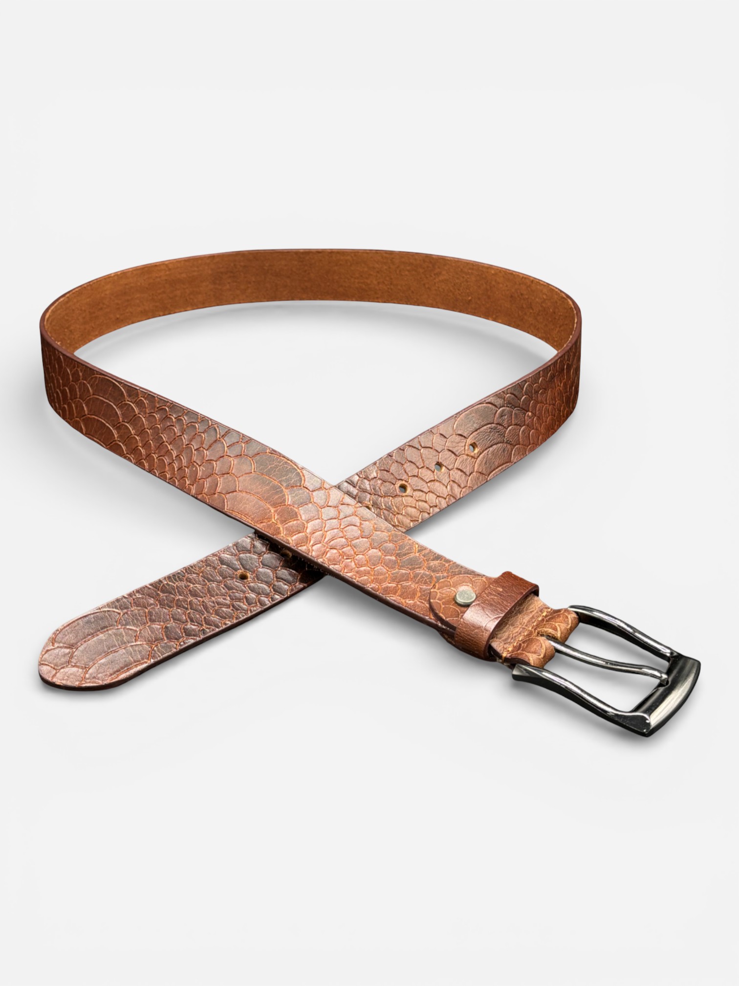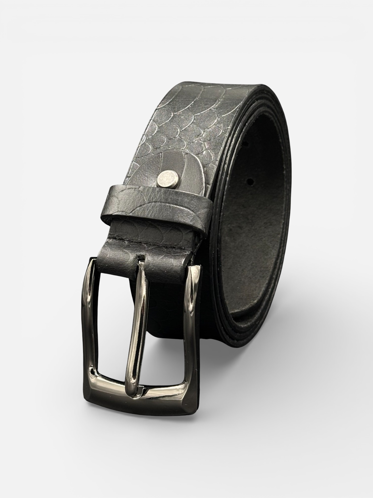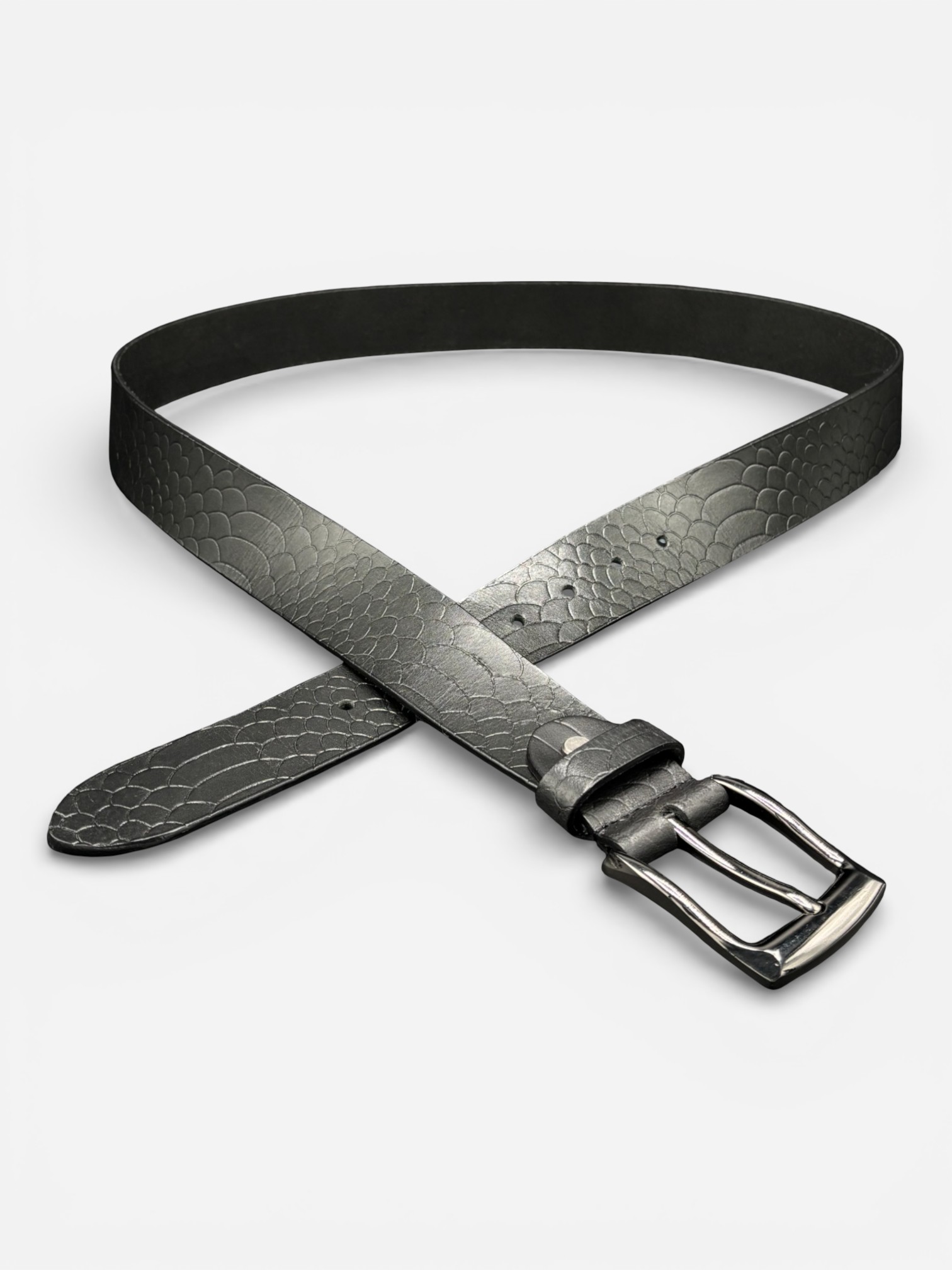 Discover a modern take on our embossed leather belt, now with a polished gunmetal buckle. This men belt is made from 100% genuine cowhide leather and built for daily strength and clean style.Key Features100% genuine cowhide leatherPremium embossed texture finishRefined gunmetal buckle designStrong and comfortable for daily useColors: Brown and BlackSizes: XS, S, M, L