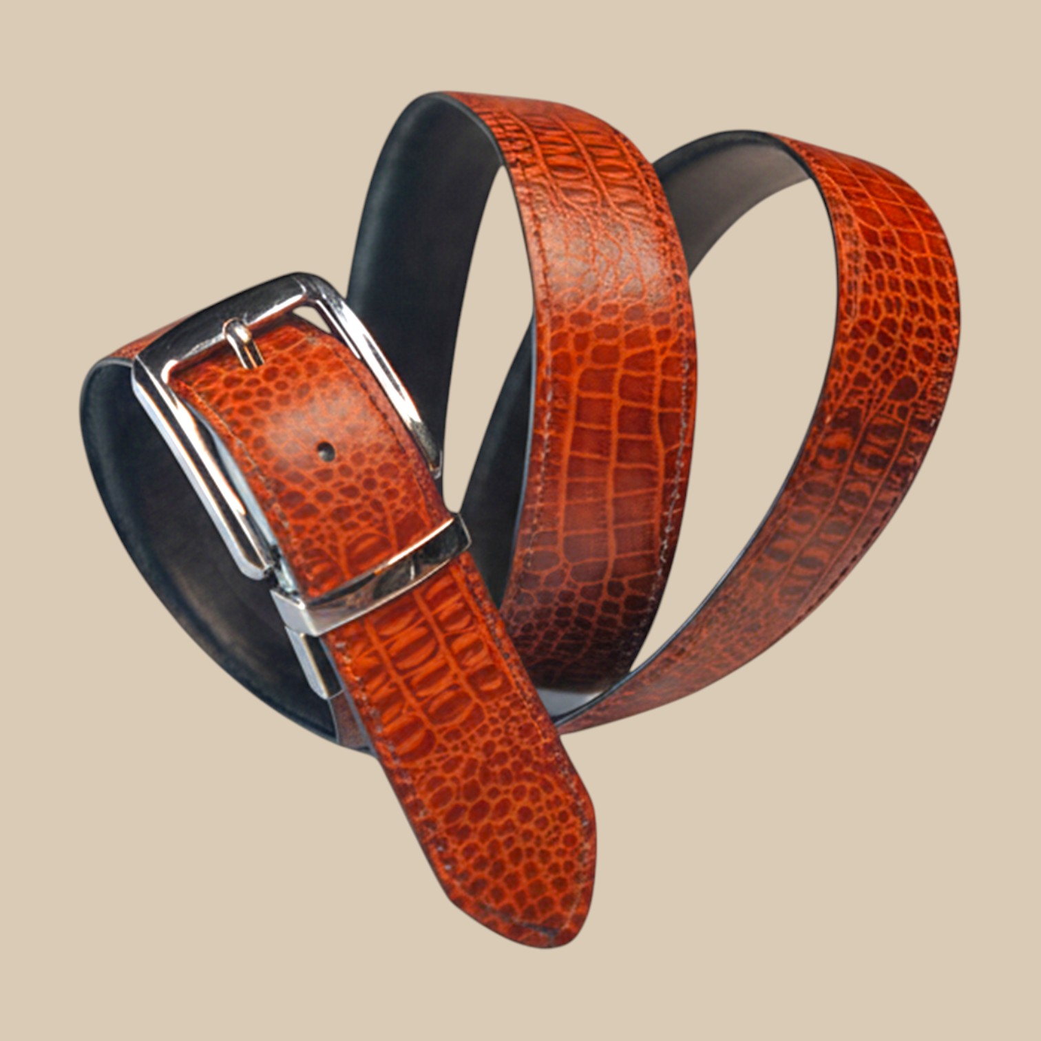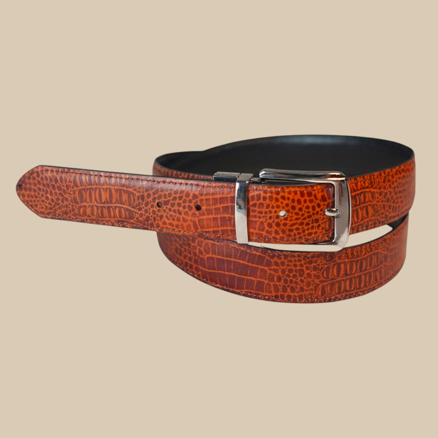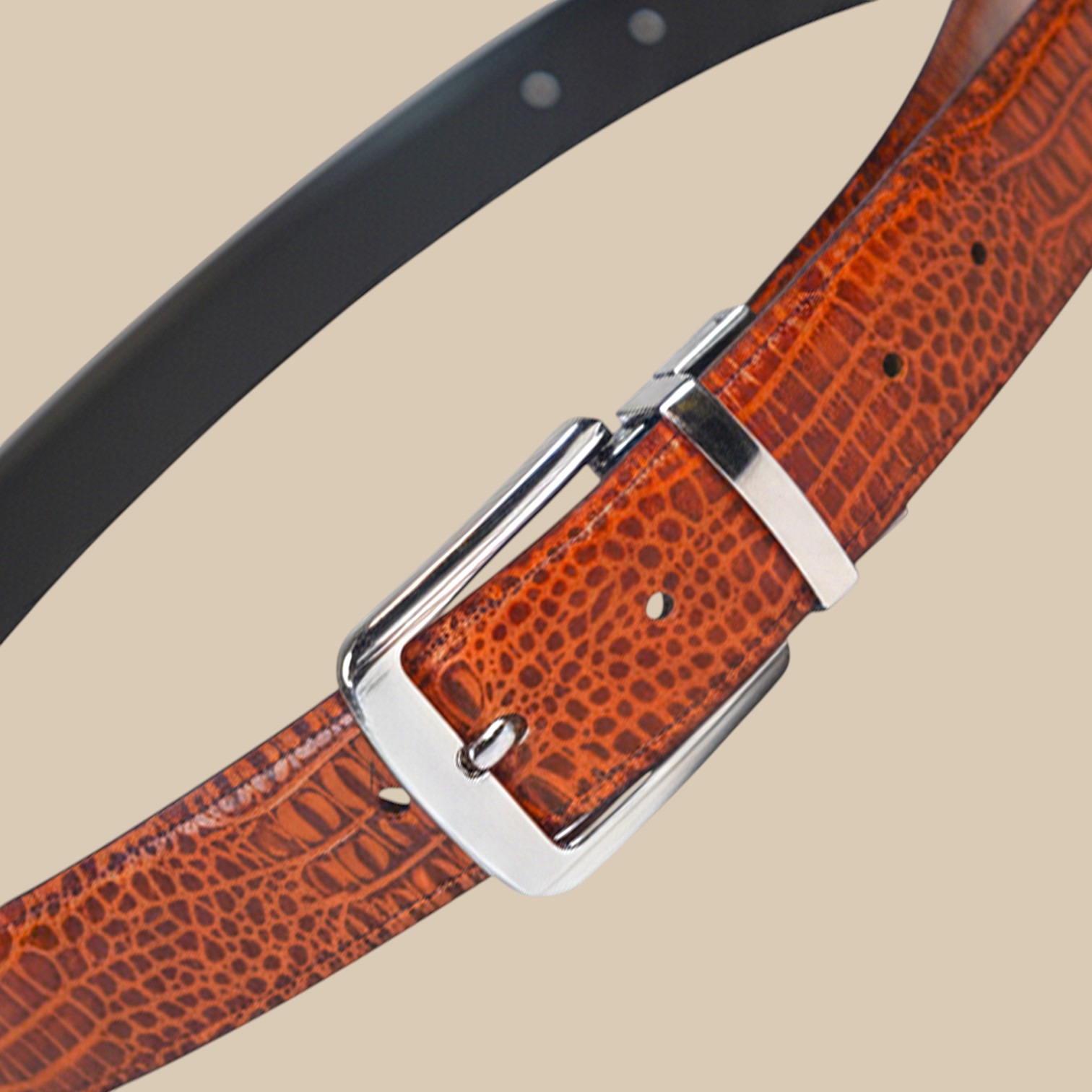 This 2-in-1 genuine cowhide leather belt features a crocodile texture on both sides, with one side in reddish-brown tan (cinnamon) and the other in black. It comes with a reversible buckle, allowing you to switch colors easily for different outfits. Perfect for both formal and casual wear.
